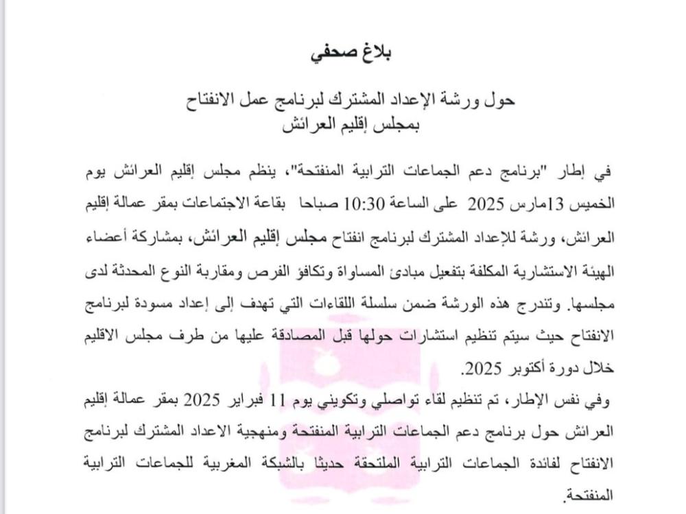 حضور السيد عبد الحكيم الاحمدي رئيس مجلس إقليم العرائش ، لحفل تدشين فضاء الذاكرة التاريخية للمقاومة وجيش التحرير، وذلك بحضور السيد المندوب السامي لقدماء المقاومين وأعضاء جيش التحرير، والسيد الكاتب العام لعمالة العرائش، إلى جانب وفد رسمي ومؤسساتي وفعاليات مدنية.